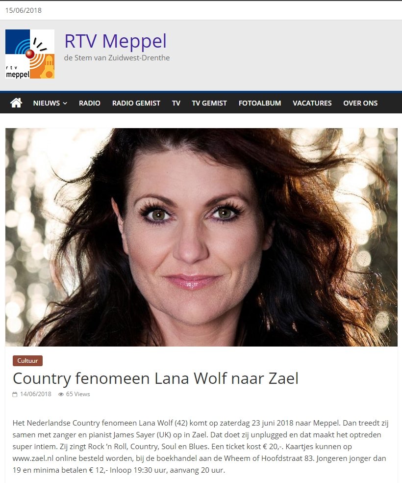 Zangeres Lana Wolf en pianist James Sayer traden zaterdagavond op in Zael in Meppel. Het Nederlandse Country fenomeen Lana Wolf (42) stal de show en blonk uit in kwaliteit. Zij trad samen op met haar begeleider, de Engelse zanger en pianist James Sayer. Dat deed zij unplugged en dat maakte het optreden super intiem. Lana zong onder andere Rock ’n Roll, Country, Soul en Blues. Lana en James schrijven behalve voor henzelf ook samen voor grote artiesten. Na afloop was uit de reacties op te maken dat het publiek had genoten.
